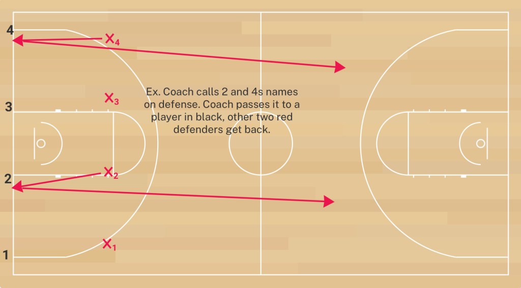 Coaching Points: Try and make sure that they aren’t taking unnecessary threes because with a 4 on 2 advantage, you should be able to get a layup so unless it’s a corner 3 it’s probably not the best shot. Next, a lot of dribbles to get the ball up the court, encourage the players to pass it up the court to get to the hoop as fast as possible. Finally make sure the defense isn’t just playing man to man because they are at a disadvantage, make sure they are getting back as fast as possible and covering things like the ball and first pass, and then rotating after the second pass, make sure the players that had their names called aren’t just running back into no man’s land but they’re getting to a spot with a purpose and not just picking up the ball, or running all the way to a player who is opposite of the ball instead of doc being in help side.